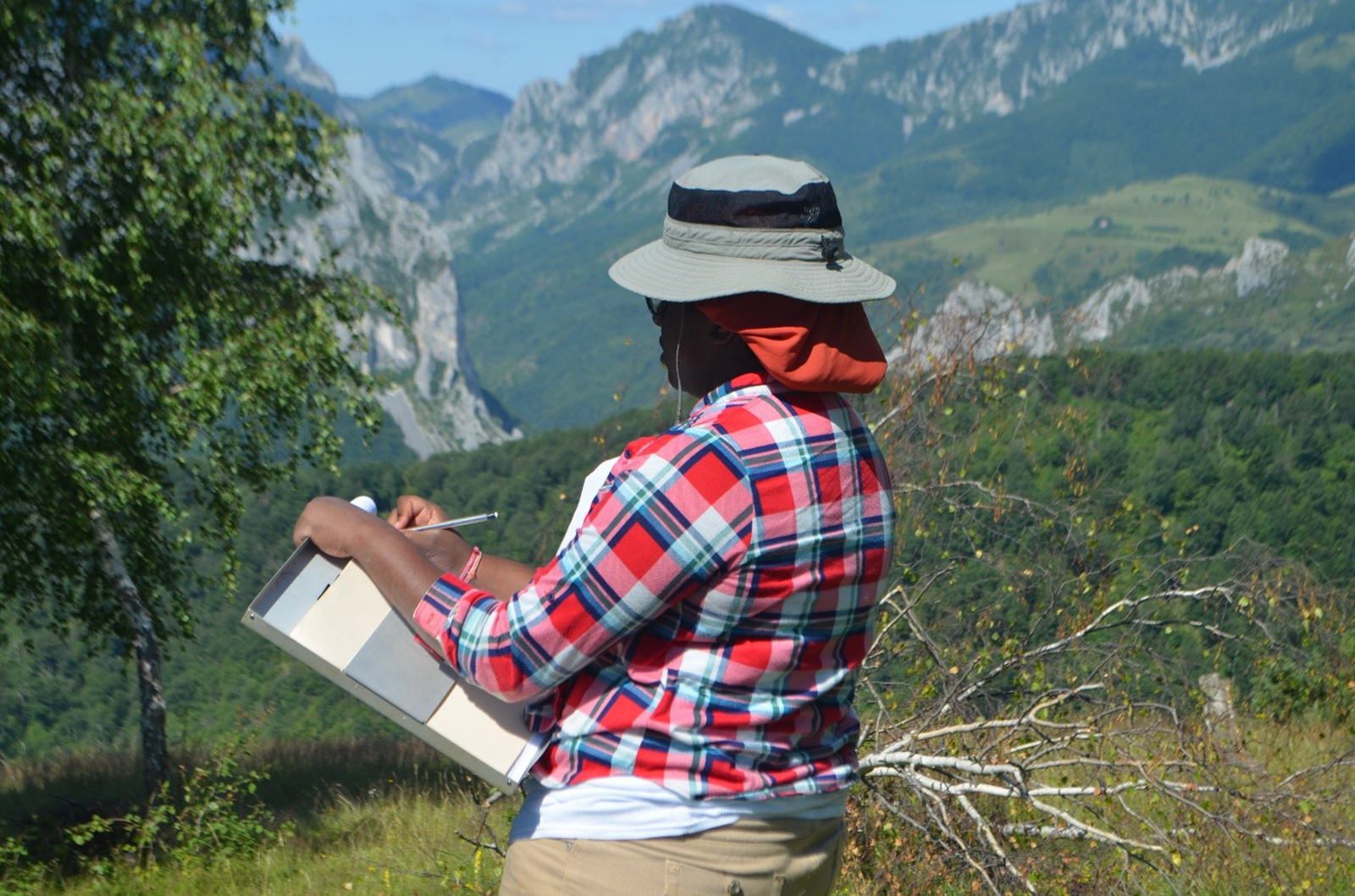 We are on a narrow road high up on one side of a huge valley. Below us slopes lush forest and in the distance tall mountains complete the valley’s other edge. The mountains are steep and green with some faces covered in exposed limestone. When we finally park I look out on a storybook landscape. Rolling hills fill the valley, covered with swaying golden grains and speckled by the yellows, purples, and whites of thriving wildflowers. The mountains seem even more immense when I spot the tiny terracotta roofs and bright white church steeple in the distance. They sit on the mountainside, specks of manmade color in the sea of green trees that coat the slopes. One hill near us sprouts tall green birch trees at its top, this grove is where we’ll dig for the next three weeks.