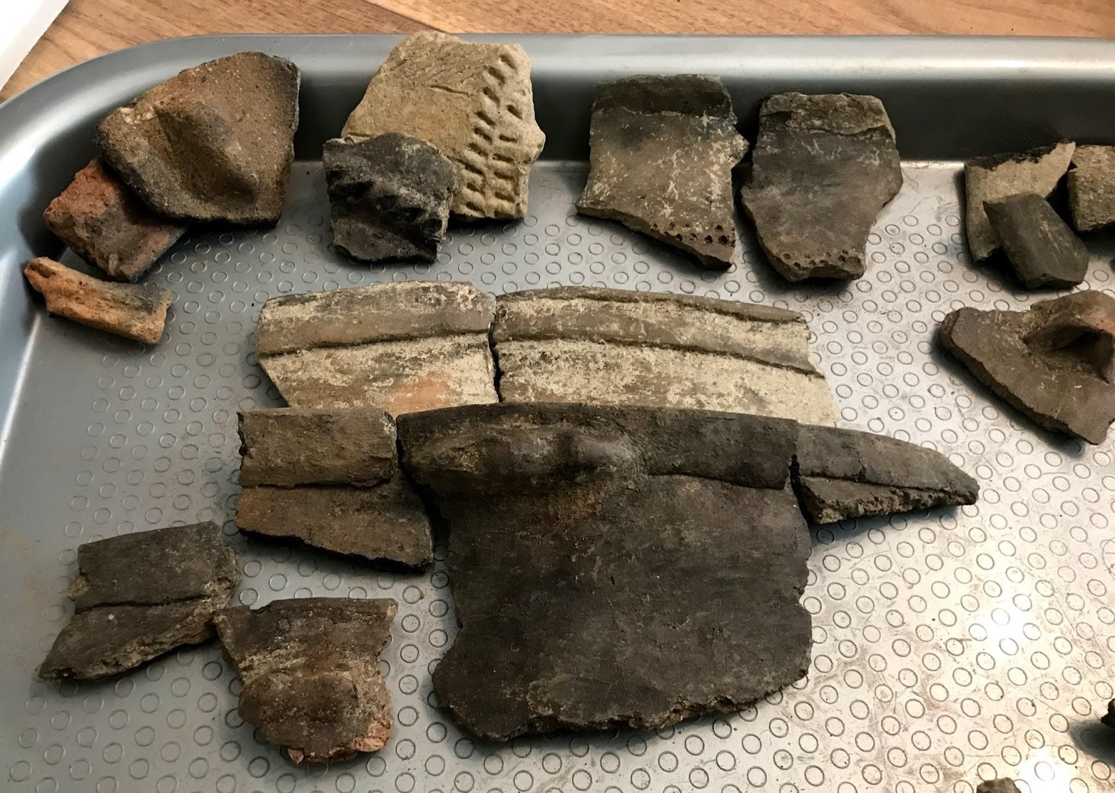 Each crate was filled with bags of artifacts, and each bag had to be sorted separately since they were from different features, such as pits and houses, within the site. We used plastic trays to organize the artifacts by type.