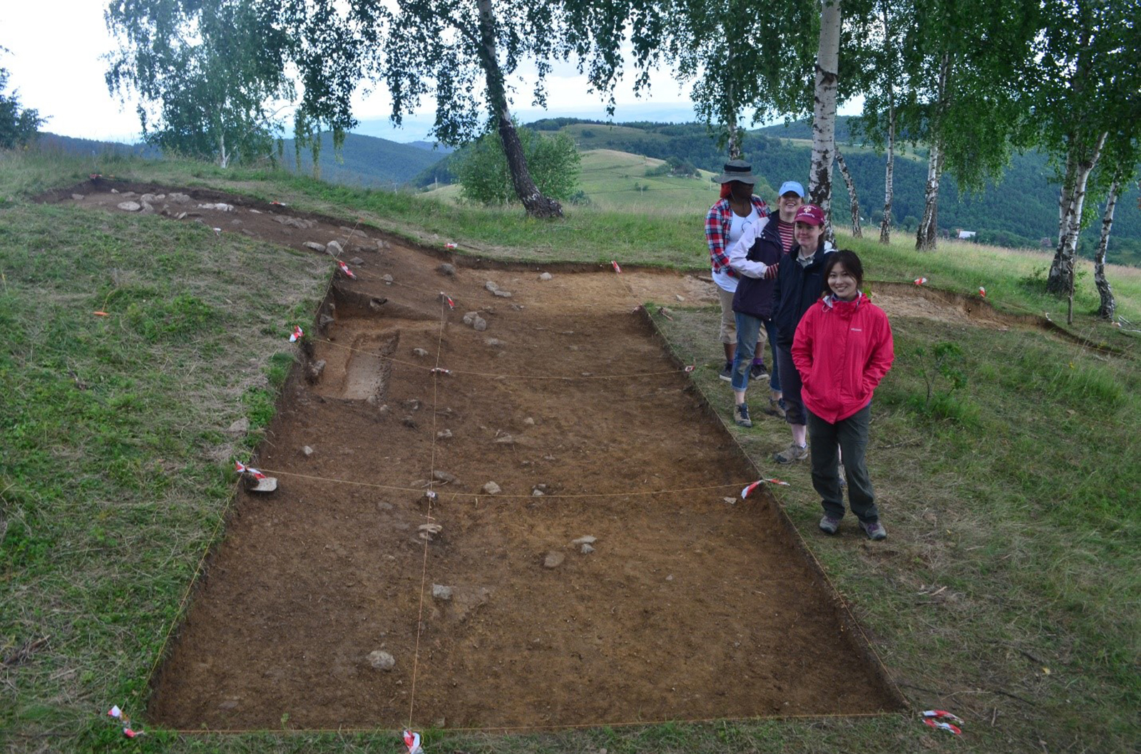 We are digging at an Early Bronze Age site in the commune of Râmet in Transylvania, Romania. This is a human burial site, so we are not excavating dinosaurs (those are paleontologists). During this time, about 2700-2000 BC, people would travel from the valleys to high peaks of hills and mountains to bury their dead. Many archaeologists speculate that they did this to mark territory – people would see the mounds in the distance and know someone lived there or they created these mounds to create links to the land from their ancestors. These mounds are found throughout Transylvania and could be seen on many hilltops throughout the area.